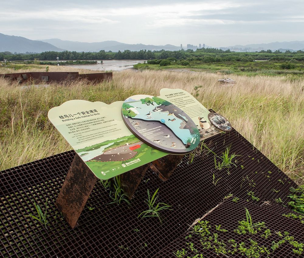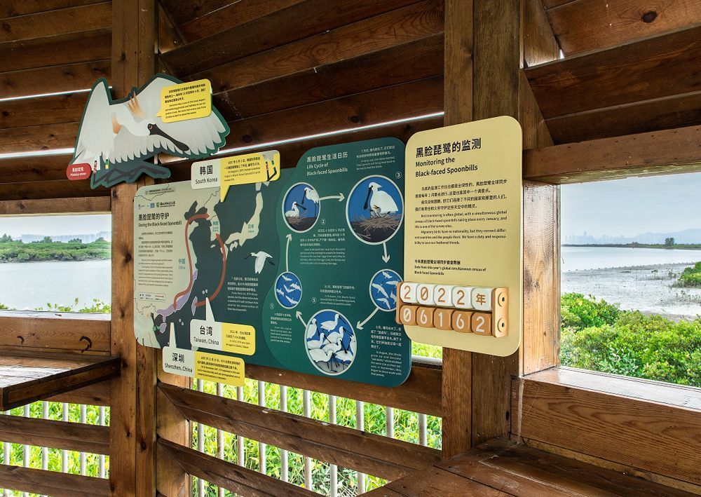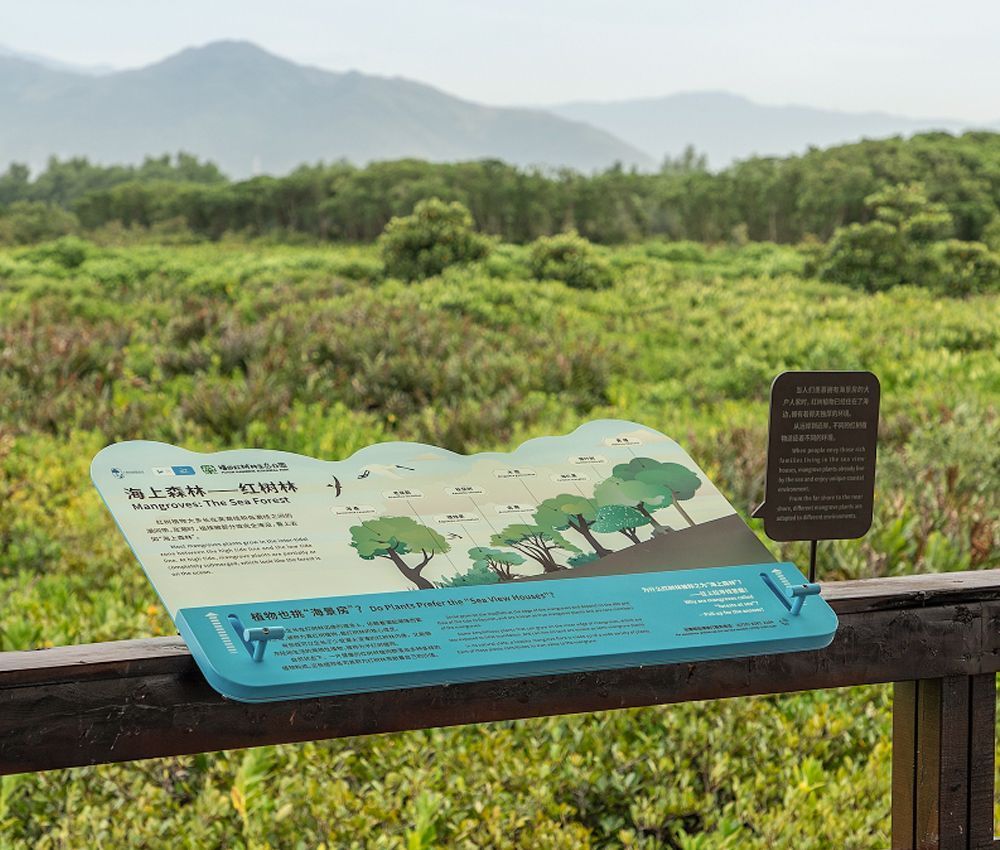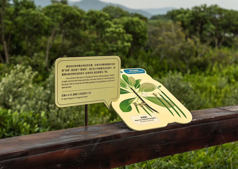 绿湾自然研学基地是开启公众亲近湿地、了解和学习环境保护之门。将湿地知识融入到游览与体验之中,园区科普导览系统分为“生态修复”和“生态探索”两大板块:16个主题、19组导视牌坐落位于全程700米的自然步道上。人们在领略自然风光的同时,通过导视牌了解湿地保护的进程、结识与观察未知的物种和互动探索红树林的秘密。