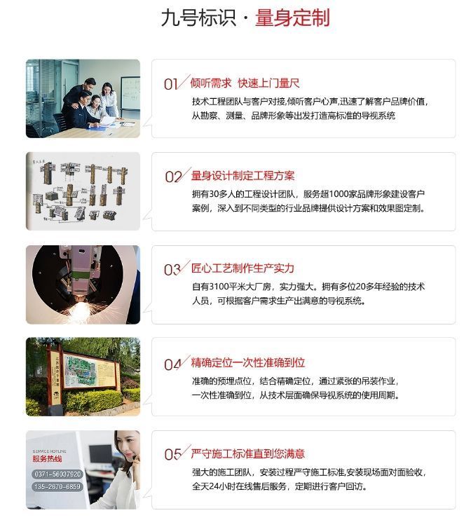 标识标牌是融合规划、建筑、空间、雕塑、逻辑、色彩、美学、材质组合于-体的产物。它既不是简单的文字,更不是所谓的牌子,它是与环境相融的艺术作品! 9号标识从考察调研到规划设计,从生产制作到安装维护,我们从不墨守成规,而是不断创造新的行业规范, 确保每一个项目从始至终走过一 段高标准的历程。