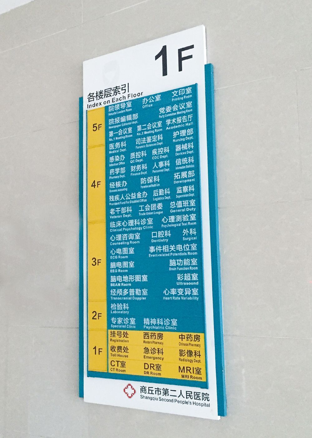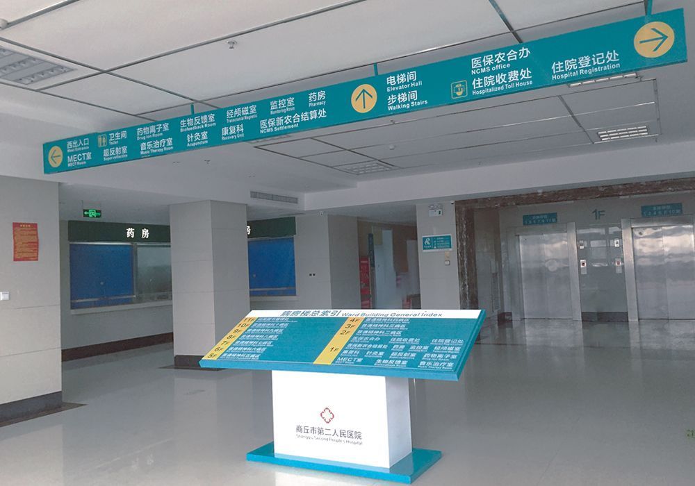 医院引导标识的设置应按照各级导向标识指示功能的不同并根据各医院实际,放置在建筑物内(外)醒目的位置。商丘二院作为精神卫生中心,标识系统的完善尤为重要